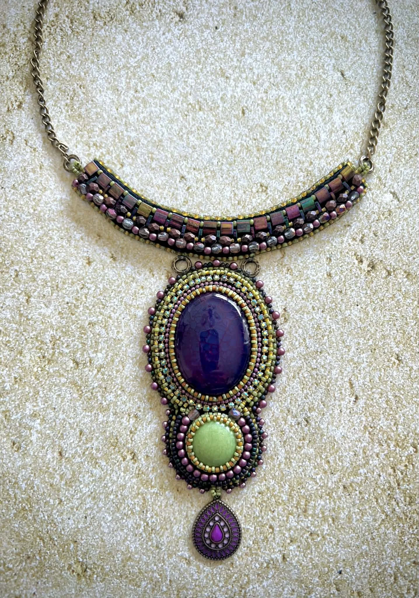 July 16-17 6-9pm Lisa Bowling will teach a brand new project featuring gemstone cab (deep pink agate shown, howlite (blue) and lapis lazuli, cupchain, lots of Czech, tila and seed beads. You decide how you want to suspend the stone cab using jump rings or chain. More details and photos to come.